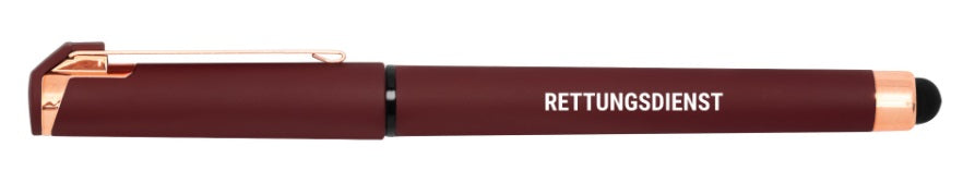 Dieser Gelschreiber in burgunderroter Vollfarbe mit roségoldener Verzierung verfügt über einen Schaft in kräftigen Farben, der durch eine atemberaubende roségoldene Verzierung ergänzt wird, und durch die flüssige Geltinte, die praktische Stiftoberseite sowie die gummierte Oberfläche und den weichen Gummigriff stundenlangen Schreibkomfort garantiert. Aufdruck "RETTUNGSDIENST".