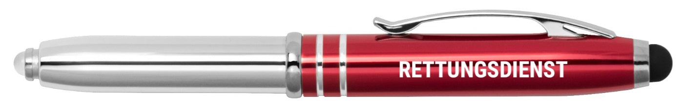 Dieser stylische Kugelschreiber bietet gleich drei Funktionen. Das Modell mit Kappe verfügt über ein LED-Licht, einen Stylus zum Bedienen von Touchscreens und eine Kugelschreibermine natürlich. Durch Drücken gegen eine harte Oberfläche lässt sich das LED-Licht einschalten. Aufdruck "RETTUNGSDIENST".